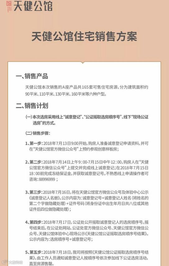 同时,天健公馆销售方案中特别提示,诚意客户只能有一个陪同进入选房现场,选房时间2分钟。