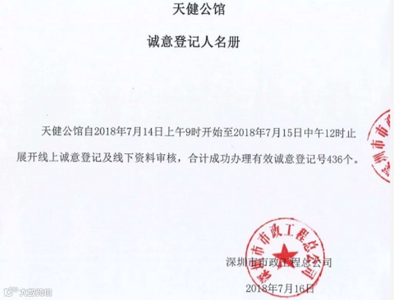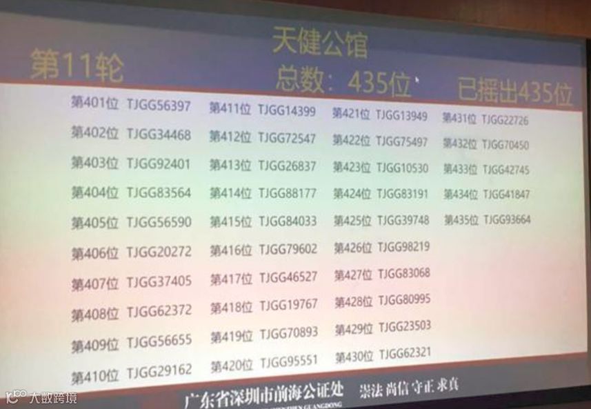 据悉,昨天下午,在深圳前海公证处,现场公布了天健公馆诚意登记名单,有效诚意登记号为435个,有一个号作废。由于天健公馆诚意登记不接受企业登记,435个登记号均为自然人。