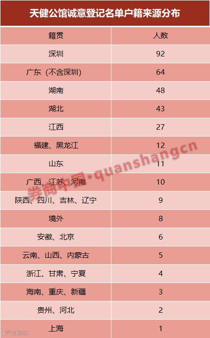 有意思的是,根据7月16日天健公馆公布的诚意登记人名册,在436名诚意登记人中,其中,92名为深圳本地户籍,广东其他地区户籍客户64名,如果加上深圳,广东户籍占比仅4成;湖南、湖北户籍占比也较大,共计91名,占比超过20%。