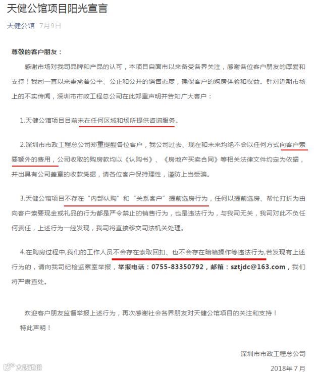 值得注意的是,7月9日,天健公馆项目发布“阳光宣言”,表示,“未在任何区域和场所提供咨询服务”、“绝不会以任何方式向客户索要额外的费用”、“不存在‘内部认购’和‘关系客户’提前选房行为”、“不会存在索取回扣、也不会存在暗箱操作等违法行为”等。