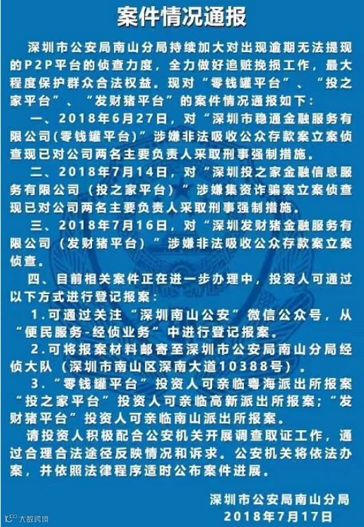 今日,深圳公安局南山分局通报了深圳连续三起平台暴雷事件的案件最新进展。