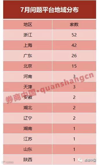 从地域分布看,这场暴雷潮席卷了全国。浙江省主要是杭州地区,网贷行业在经历了过去三年如雨后春笋的发展之后,也迎来阵痛,7月问题地区问题平台数近50家;紧随其后的是上海,达到42家,且不少涉雷平台,如唐小僧、永利宝等交易规模都不小。
