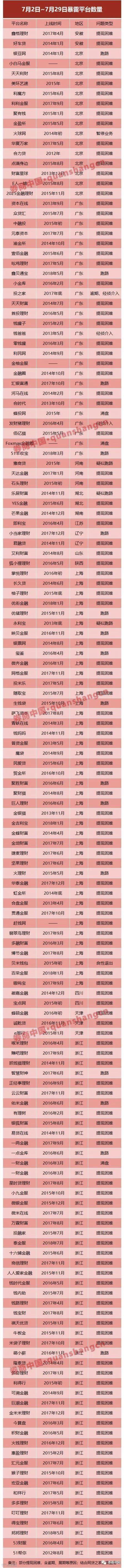 网贷行业经历了一个完整的“至暗”7月。官方数据,今年5月、6月的网贷行业消亡平台数分别是28家、64家;据券商中国记者粗略统计,7月问题平台数骤然飙升至153家!其中发生在7月2日-18日的是105家,7月19日-29日是48家。