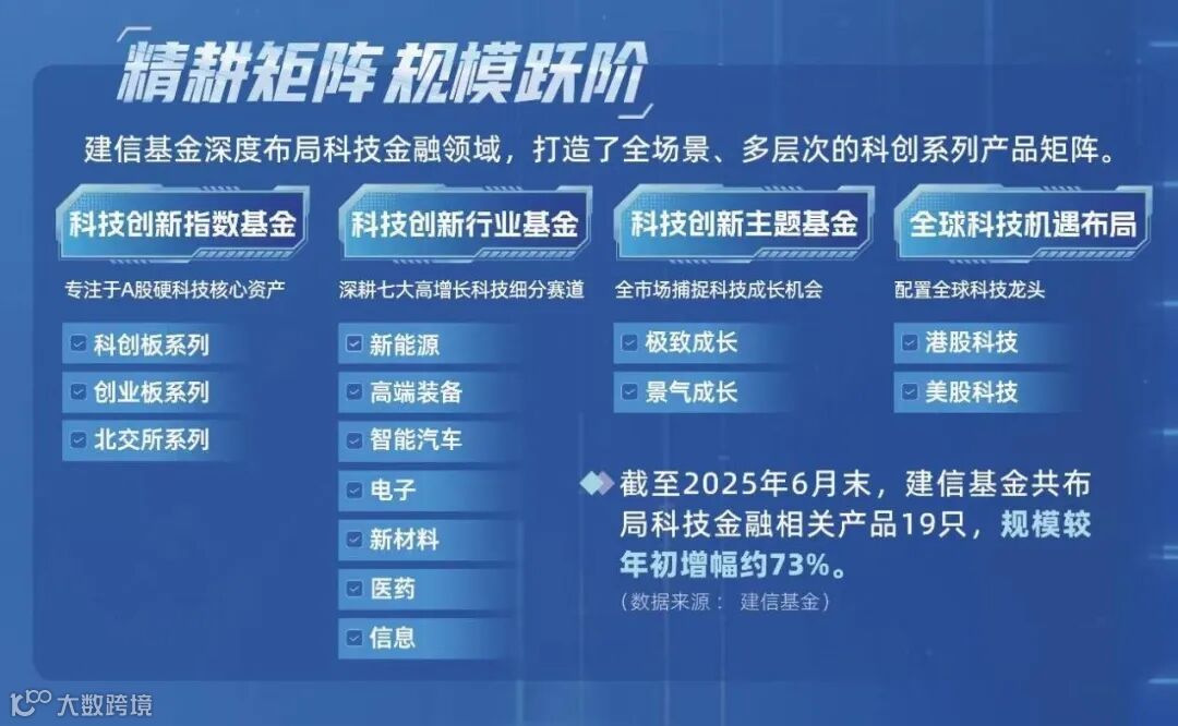 一直以来,建信基金着力构建覆盖全谱系的“正金字塔型”产品体系,囊括现金管理、固收、被动指数、主动权益、FOF、REITs等多元资产类别,并横跨A股、港股、美股等不同市场。在权益条线中,最鲜明的变化是对科技创新与国家战略方向的坚定聚焦。截至2025年6月30日,建信基金在战略性新兴产业等泛科技领域的投资占比已超过其权益投资总额的64%,彰显其深度参与中国经济转型升级的决心。