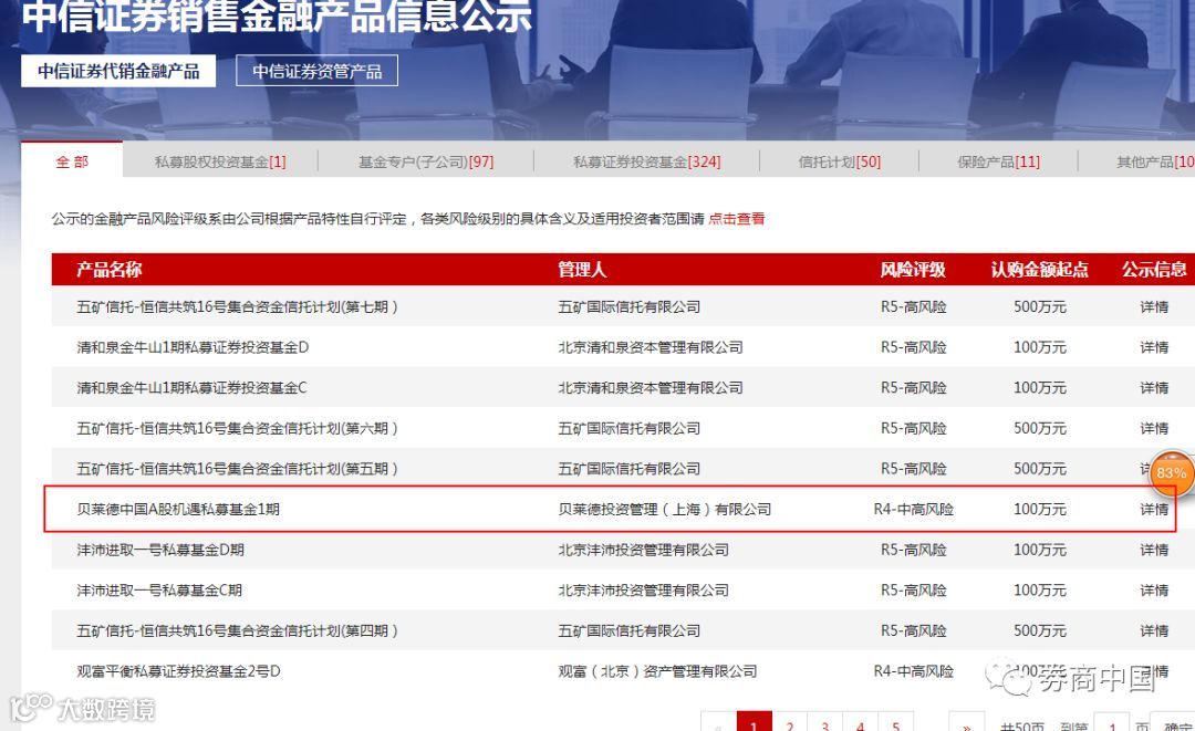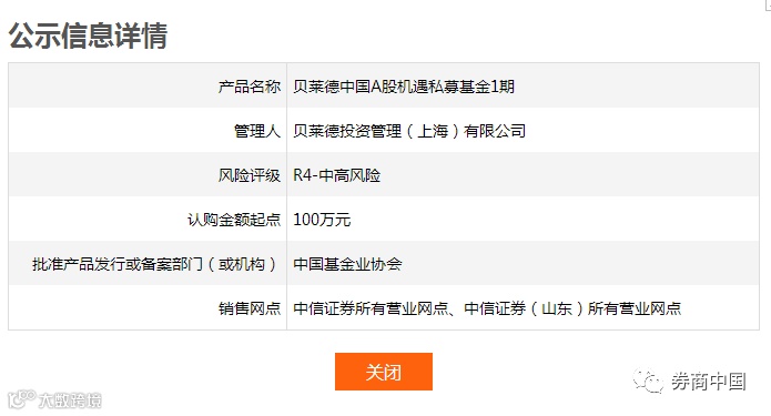 中信证券官网代销产品的信息显示,贝莱德中国A股机遇私募基金1期的风险评级为“R4-中高风险”,认购金额起点为100万元,销售网点为中信证券所有营业网点和中信证券(山东)所有营业网点。