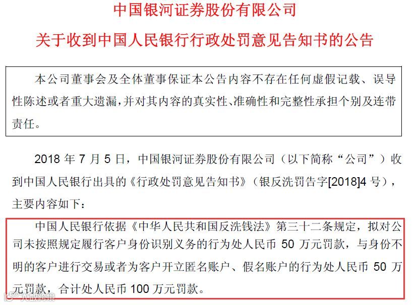 银河证券今日最新公告,因未履行客户身份识别义务,与身份不明的客户进行交易或者为客户开立匿名账户、假名账户,被央行合计罚款100万元。
