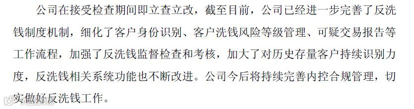 截至目前,银河证券已经进一步完善了反洗钱制度机制,细化了客户身份识别、客户洗钱风险等级管理、可疑交易报告等工作流程,加强了反洗钱监督检查和考核,加大了对历史存量客户持续识别力度,反洗钱相关系统功能也不断改进。今后将持续完善内控合规管理,切实做好反洗钱工作。