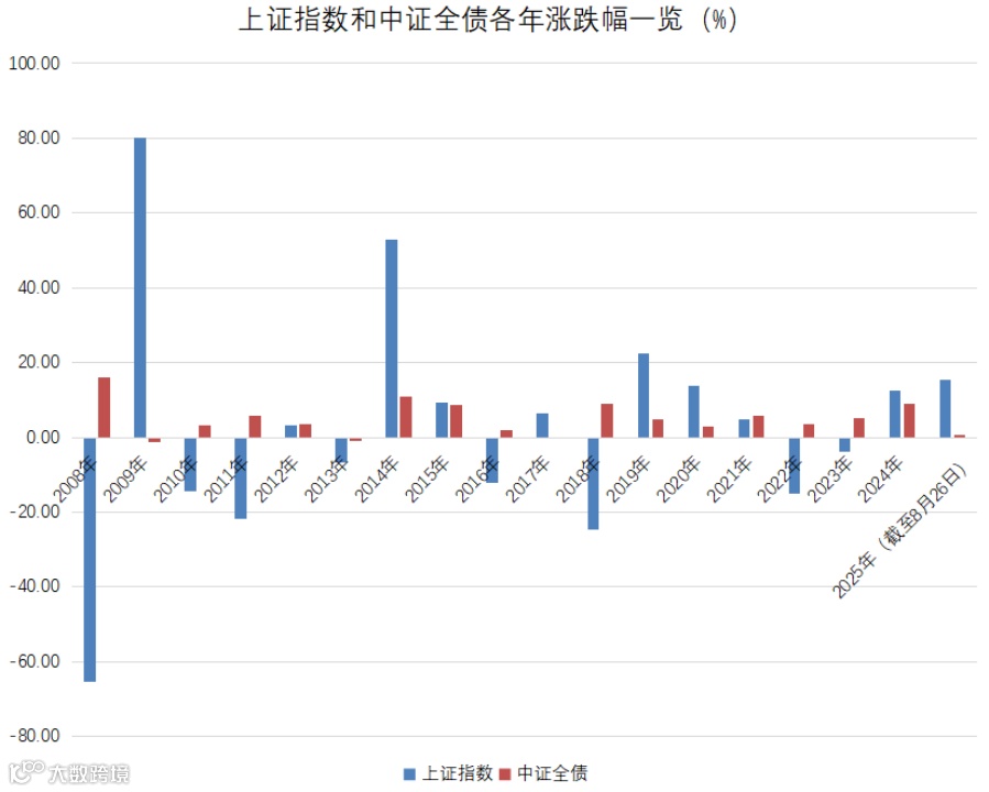 具体可从两个典型年份窥见一斑:2018年上证指数跌幅达24.6%,同期中证全债指数涨幅却达8.85%,此时“固收+”产品通过“少权益、多债券”的配置,仍能实现正收益;而在权益市场表现突出的2009年,上证指数大涨79.98%,中证全债指数虽下跌1.4%,但凭借权益部分的丰厚回报,“固收+”产品同样能获得可观收益。