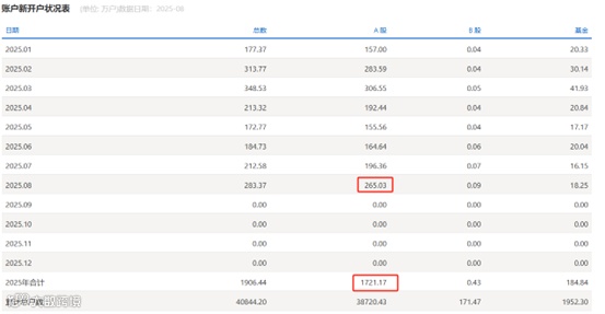 其中,8月新开户数265万户,仅次于今年2月和3月单月新开户数,且高于2024年全年10个月份单月的新开户数。