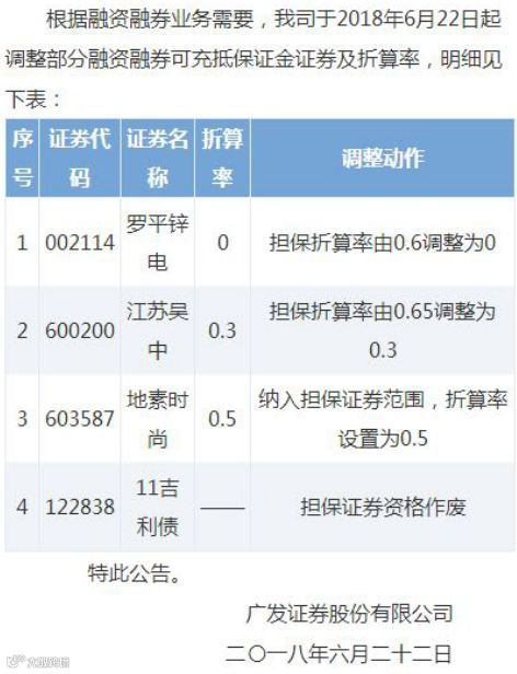 比如,广发证券今日在官网上宣布,将罗平锌电(002114.SZ)担保折算率由0.6调整为0,江苏吴中(600200.SH)担保折算率由0.65调整为0.3。