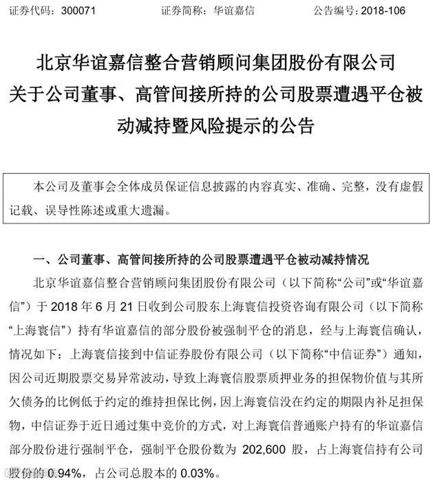 昨日,华谊嘉信公告收到股东上海寰信被强制平仓的消息,因股票交易异常波动,质押的股票担保物价值与其所欠债务的比例低于约定的维持担保比例,并且未在约定的期限内补仓,中信证券于近日通过集中竞价的方式,对上海寰信普通账户持有的华谊嘉信部分股份进行强制平仓,强制平仓股份数为20.26万股,占上海寰信持有公司股份的0.94%,占该上市公司总股本的0.03%。