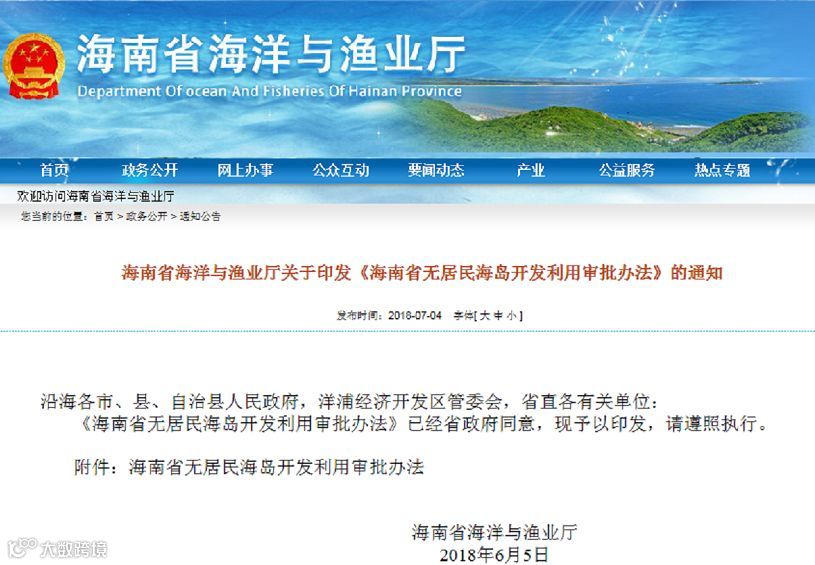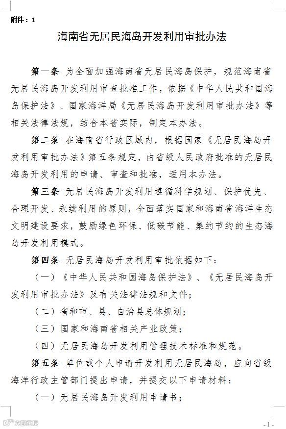 海南省海洋与渔业厅4日公布《海南省无居民海岛开发利用审批办法》,明确单位或个人申请开发利用无居民海岛,应向省级海洋行政主管部门提出申请,并提交无居民海岛开发利用申请书、具体方案和项目论证报告。