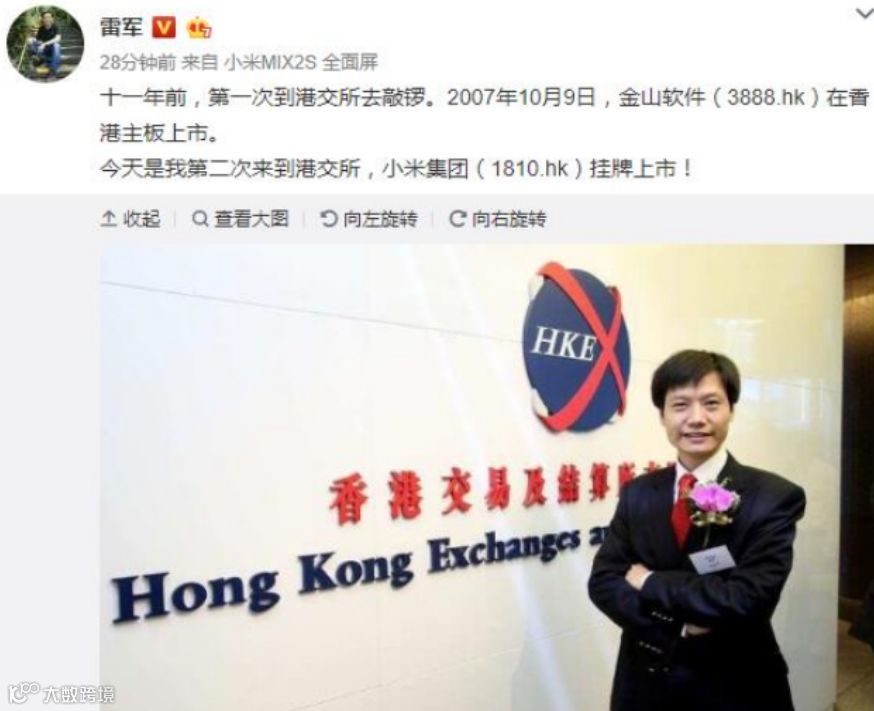 今晨8点,雷军发微博称,第二次来到港交所敲锣,上一次是十一年前的金山软件上市。