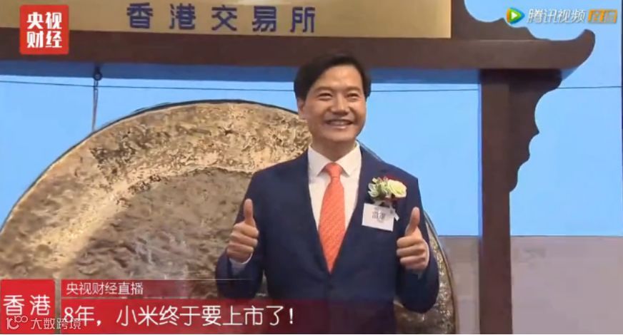 9时30分,小米上市仪式上,小米董事长雷军、香港财政司司长陈茂波、港交所主席史美伦、港交所行政总裁李小加和小米米粉代表洪骏等一起参加上市敲锣仪式。