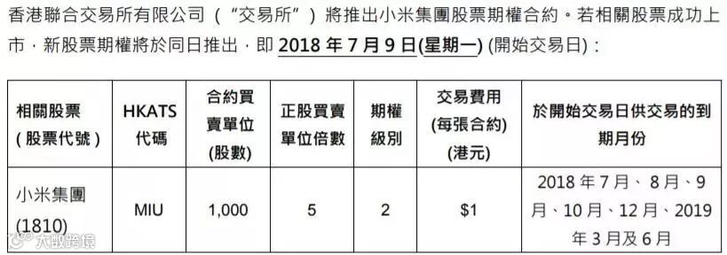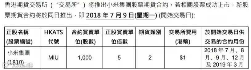 小米期货及期权将于2018年7月9日小米上市日同日推出。
