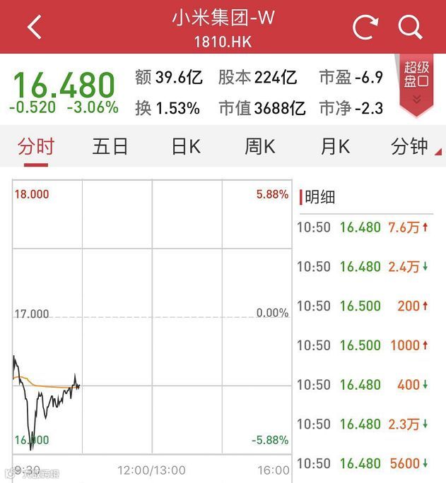 截至券商中国发稿,小米盘中一度下跌近6%,总市值不足3600亿港元。