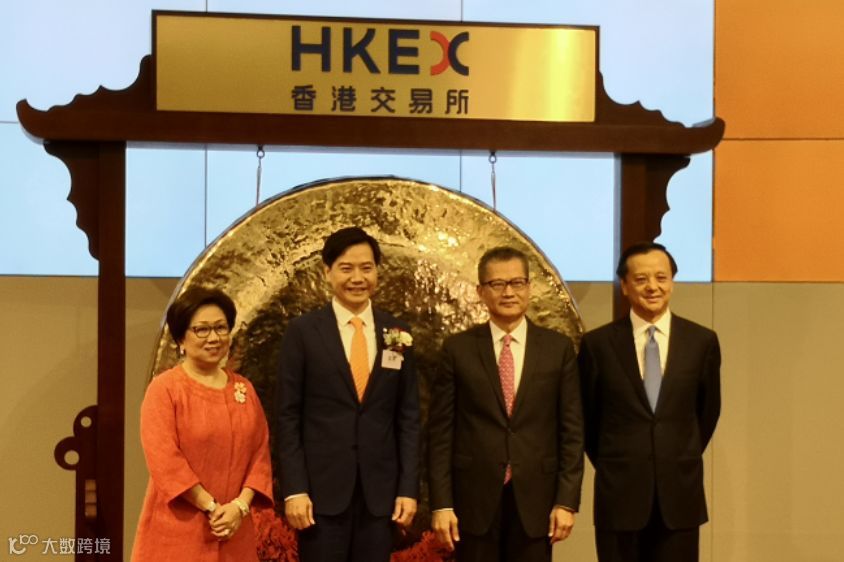 ▲小米董事长雷军(左二)、香港财政司司长陈茂波(右二)、港交所主席史美伦(左一)、港交所行政总裁李小加(右一)合影