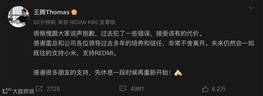 当日晚间11点多,王腾在其微博账号上发文称:“很惭愧跟大家说声抱歉,过去犯了一些错误,接受该有的代价。感谢雷总和公司各位领导过去多年的培养和信任,非常不舍离开。未来仍然会一如既往的支持小米,支持REDMI。”