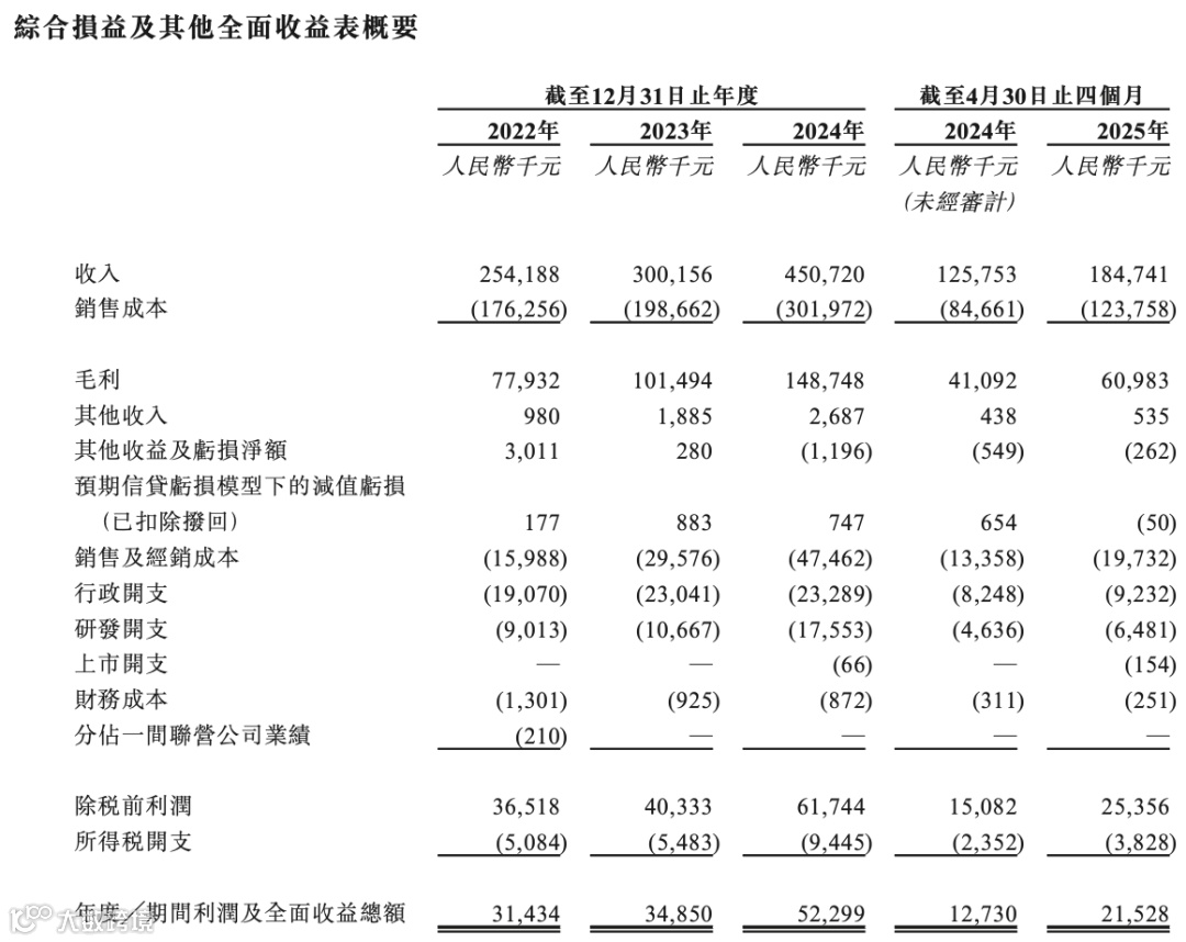 财务方面,大行科工的收入由2022年的2.54亿元(人民币,下同)增加至2023年的3亿元和2024年的4.51亿元,复合年增长率为33.1%。年度利润及全面收益总额则由2022年的3143万元增至2023年的3485万元,和2024年同期的5230万元,复合年增长率为29.1%。今年前四个月,该公司的区间利润及全面收益总额为2153万元,同比增长69.3%。