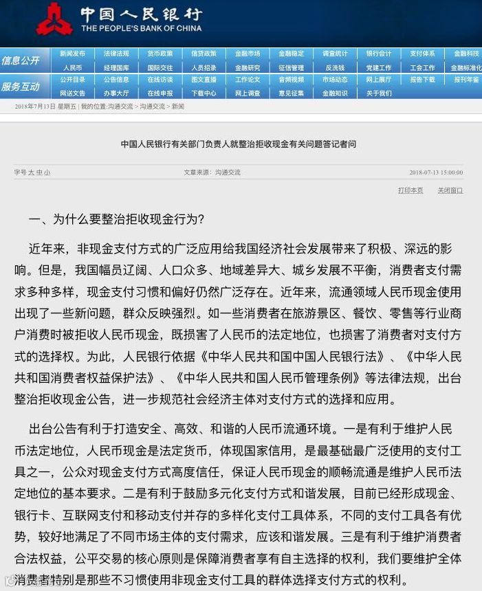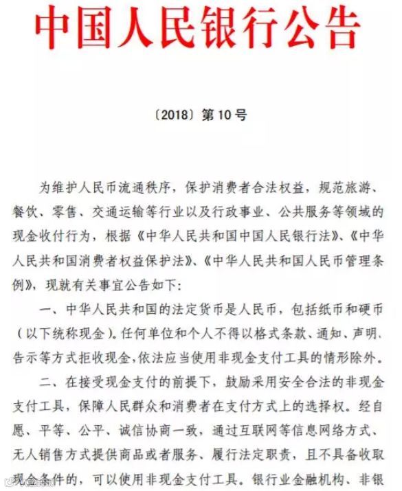 为维护人民币流通秩序,保护消费者合法权益,规范旅游、餐饮、零售、交通运输等行业以及行政事业、公共服务等领域的现金收付行为,央行发布了【2018】10号公告,公告明确,中华人民共和国的法定货币是人民币,包括纸币和硬币(以下统称现金)。任何单位和个人不得以格式条款、通知、声明、告示等方式拒收现金,依法应当使用非现金支付工具的情形除外。