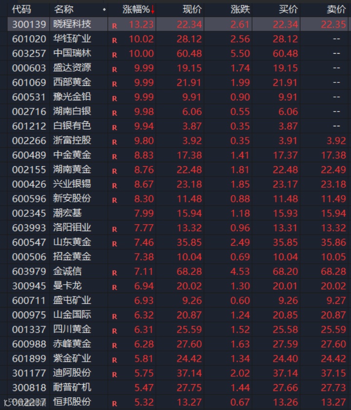 截至13:30,Wind贵金属指数、黄金珠宝指数分别上涨6.26%、5.14%,通达信黄金概念指数涨3.95%。个股方面,中国瑞林、西部黄金、盛达资源、豫光金铅、湖南白银、白银有色、华钰矿业涨停,晓程科技涨超13%,中金黄金、湖南黄金涨近9%,洛阳钼业、山东黄金、招金黄金涨超7%,四川黄金、赤峰黄金等涨超6%,紫金矿业涨幅也接近6%。