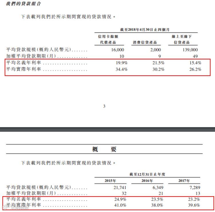 以2017年为例,给客户的平均贷款规模为7289元,贷款期限13个月,平均的名义上年利率是23.2%,但是平均实际年利率却高达39.6%,这一利率显然已高于国家规定的年化借款利率不得高于36%的红线。