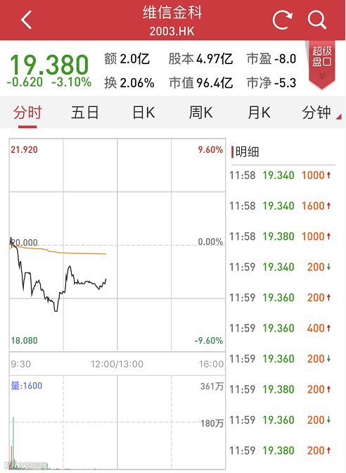 今日(6月21日),维信金科(02003,HK)在港交所正式挂牌交易,作为智能金融第一股的维信金科也未能逃脱首日破发的命运:开盘价20港元/股与招股发行价持平,后续交易价格持续下跌,迅速跌破发行价,截至券商中国记者发稿,报价19.38港元。