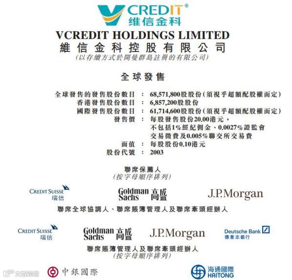 6月20日,维信金科公布了港股IPO定价结果,此次发行6857.18万股,每股发行价定为20港元,募集净额11.9亿港元。