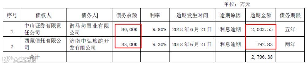 中弘控股在今日(7月16日)发布公告称,公司未能清偿到期债务,截至6月20日,逾期债务本息合计金额达到40.85亿元,其中新增到期债务两笔,包括:对中山证券的债务余额8亿元,未能偿还利息,逾期金额2003.55万元;对西藏信托的债务余额3.3亿元,也是未能偿还利息,逾期金额792.83万元。