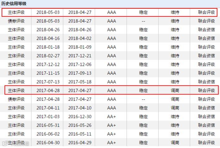 自从2017年4月将中融新大的主体评级提升到AAA后,联合评级一直维持了这一评级,且在2018年4月27日的跟踪评级中,也依然确认这一最高评级。