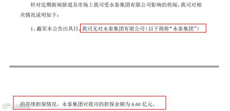 针对市场的担忧,中融新大的公告明确表示,“截至本公告出具日,我司无对永泰集团的存续担保情况,永泰集团对我司的担保余额为6.60 亿元。”。