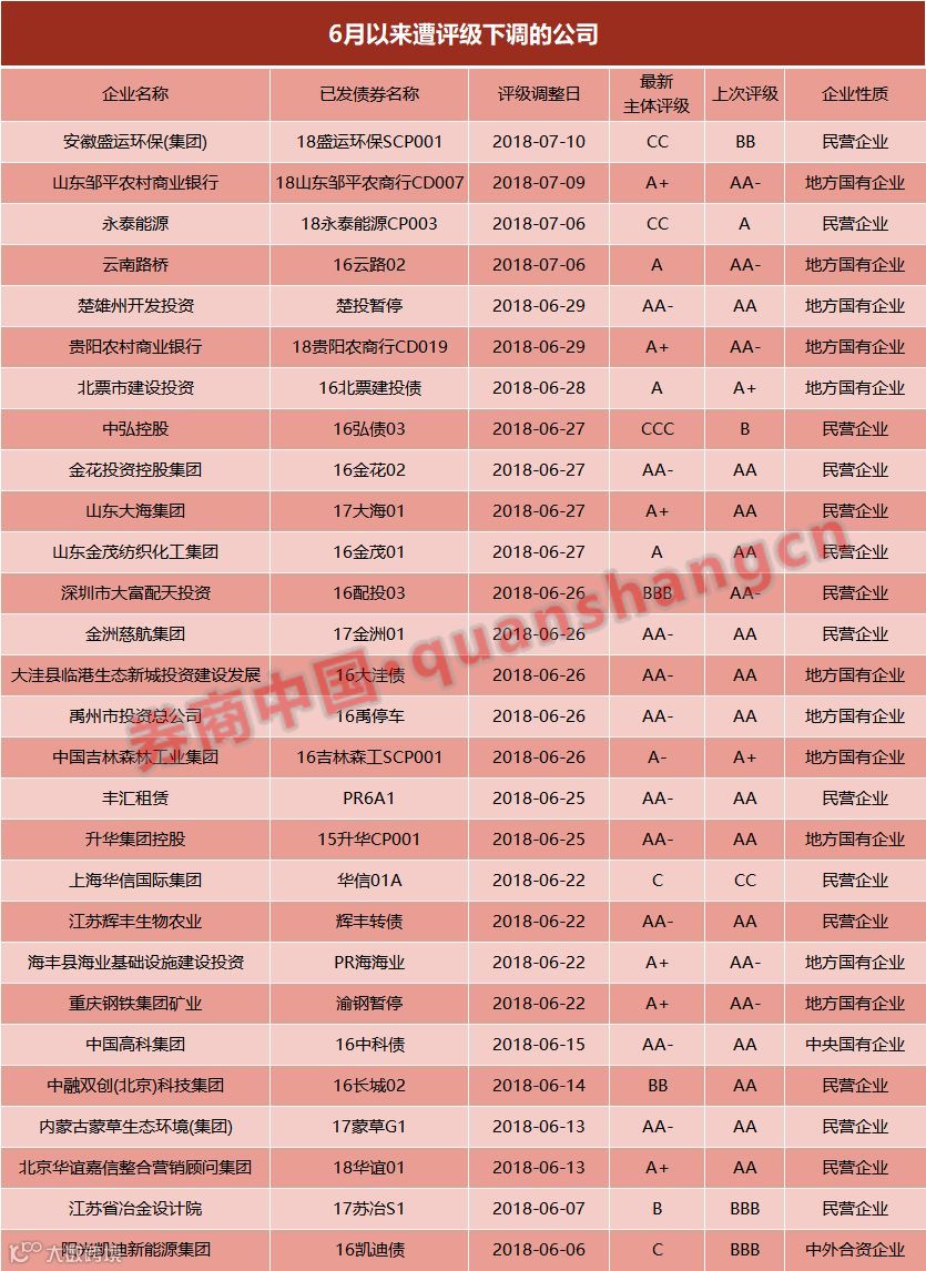 在6月以来的评级下调中,有8家公司被调整至了A级以下,5家公司被调至C级以下。