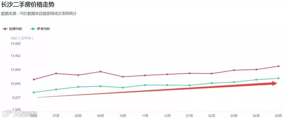 根据链家发布的数据来看,长沙房价近一年时间持续攀升,从9000元附近攀升至11000元。