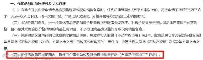 8、暂停企业在限购区域内购买商品住房,已购买的商品住房须取得不动产权属证书满5年后方可转让。