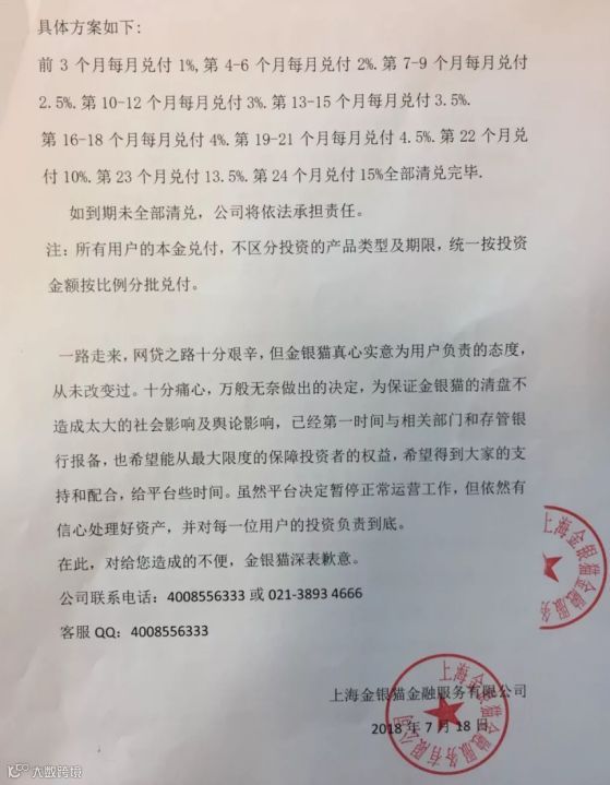 18日上午,网贷平台金银猫发布“良性清盘延期兑付公告”,直言清盘原为当前P2P生存环境的恶化:投资者信心不足,资金流出剧增,部分投资人还款意愿丧失以及还款能力不足,给金银猫经营造成重大影响,流动性几近枯竭。自公告发布即日起,平台将停止相关业务运营。对投资者最关心的兑付问题,金银猫在公告中承诺不跑路,不失联,并明确了兑付方案: