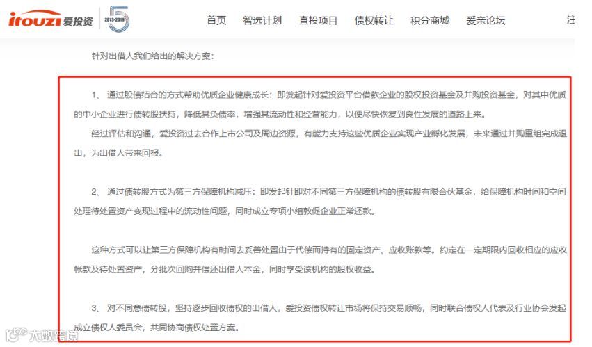 1、债转股方案:发起针对爱投资平台借款企业的股权投资基金及并购投资基金,对其中优质的中小企业进行债转股扶持;发起针即对不同第三方保障机构的债转股有限合伙基金,给保障机构时间和空间处理待处置资产变现过程中的流动性问题,同时成立专项小组敦促企业正常还款;