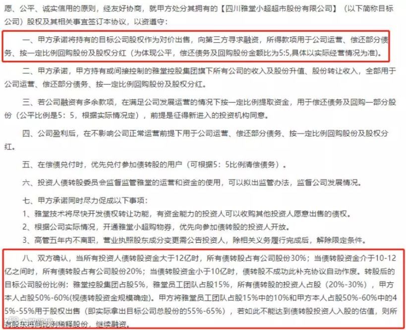 多位业内人士对券商中国记者表示,前日平台董事长杨定平刚刚自首的民间高返平台“雅堂金融”,在官网甩卖旗下商超的股权,拟以此融资,所得款项用于公司运营、偿还部分债务、按一定比例回购股份及股权分红;而且,在该份股权转让补充协议中,还提出了尝试债转股方案,具体来看,就是根据债转股募集金额的不同,计划将雅堂控股及雅堂员工团队所持股份的不同比例用于股权出售。