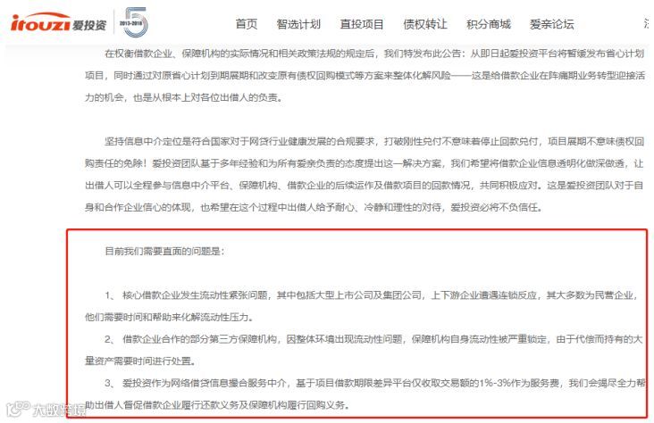 7月18日,爱投资在其社区发布《关于坚持良性发展、坚持信息中介定位、提升平台项目信息披露标准的公告》称,目前爱投资和投资人需要直面的问题是: