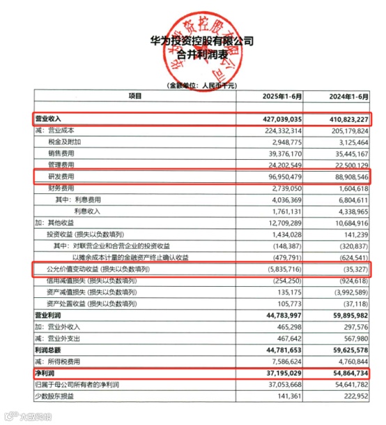 8月29日,华为投资控股有限公司发布2025年上半年报,今年上半年华为营收4270.39亿元,同比增长3.94%,净利润371.95亿元,同比下降32%。其中,研发投入969.50亿元,同比增9.04%,占营收22.7%。