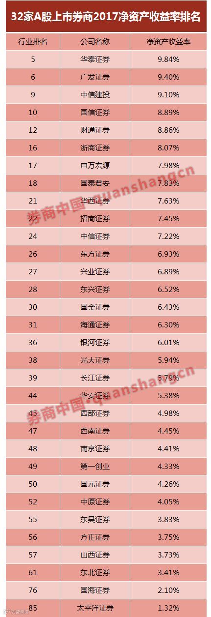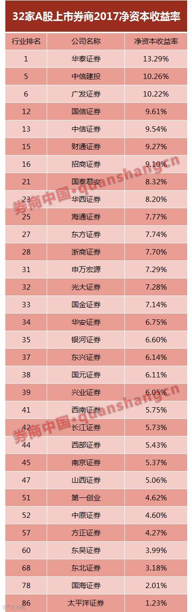 从2017年净资本收益率来看,最新32家A股上市券商中,华泰证券以13.29%位居第一;中信建投紧随其后,为10.26%,位居A股上市券商第二,全行业第五。