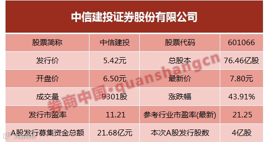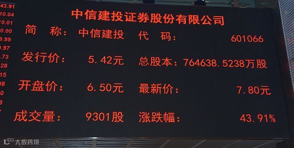中信建投证券(股票简称:中信建投,股票代码:601066)今日在上交所上市交易,早盘毫无悬念封于涨停,涨幅43.91%,报收7.80元,总市值596.42亿元,流通市值31.2亿元。中信建投此次A股发行数量为4亿股。