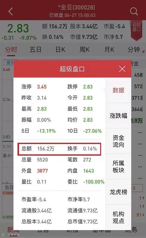 今日,*金亚复牌后毫无悬念跌停,但成交额却略超市场预期。数据显示,*金亚成交额高达156.2万元。来对比一下已经明确退市的3只股票,在退市整理期的首个交易日的成交表现:退市昆机成交2900元;烯碳退成交1.42万;退市吉恩成交10.87万元。