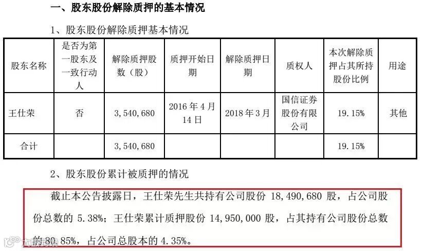 3月29日的公告中提到,二股东王仕荣的354万股已于3月份从国信证券处解除质押。不过,整体来看,截止3月29日,王仕荣先生共持有公司股份1849.07万股,占公司股份总数的 5.38%;王仕荣累计质押股份1495万股,占其持有公司股份总数的80.85%,占公司总股本的 4.35%。