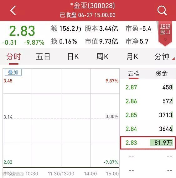 今日,*金亚复牌后毫无悬念跌停,截至收盘,卖一位置仍然堆积了82万手封单,但156.2万元的单日成交额却超出市场预期。要知道,作为创业板股票,一旦退市将一退到底,无法重新上市,再无翻身机会。