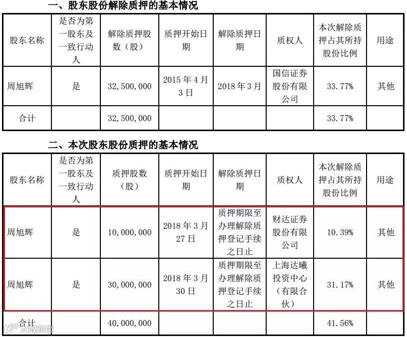 公告中还提到,截止本公告披露日,周旭辉先生共持有公司股份9625.12万股,占公司股份总数的27.98%;周旭辉累计质押股份9201.6万股,占其持有公司股份总数的95.60%,占公司总股本的26.75%。