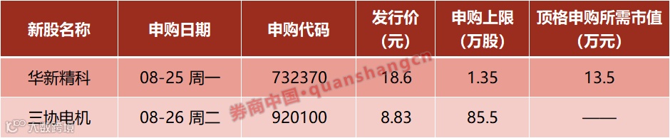 本周(8月25日—8月29日)有2只新股发行。周一:华新精科;周二:三协电机。