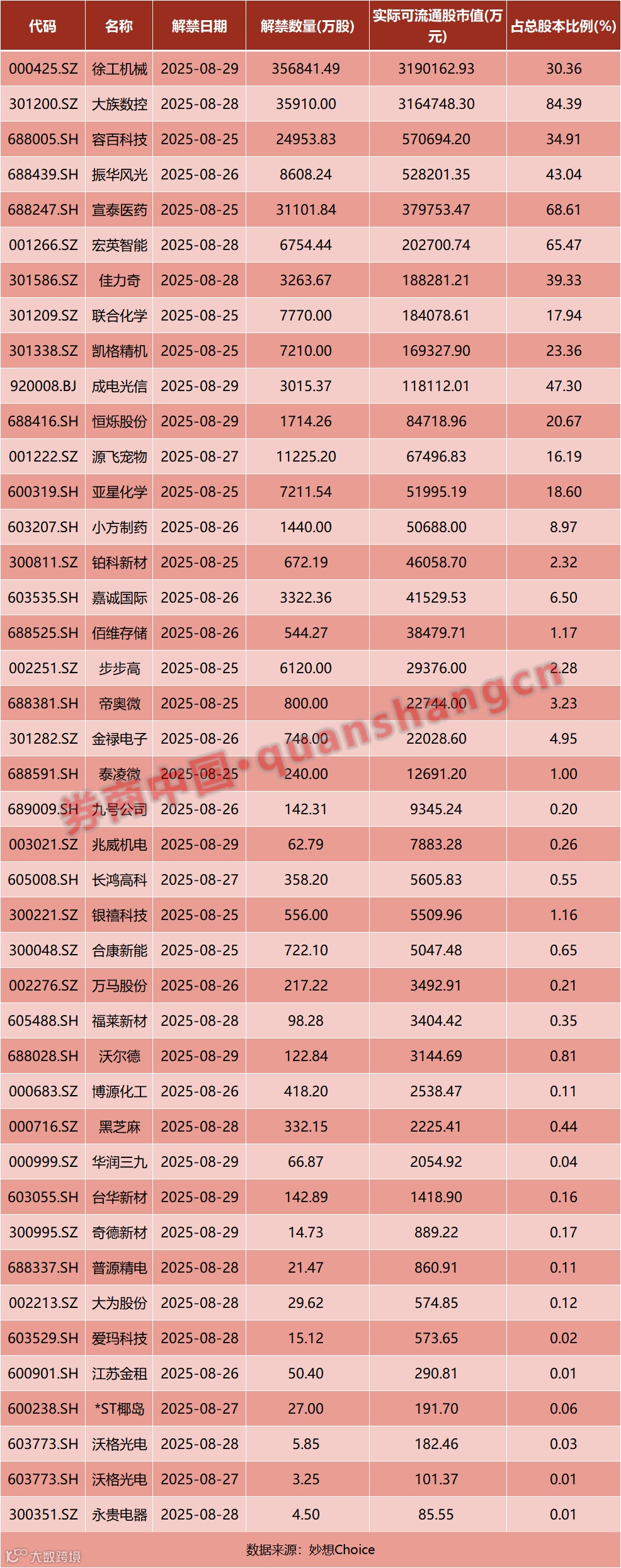数据显示,本周(8月25日—8月29日)共有42家公司限售股陆续解禁,合计解禁52.29亿股,按最新收盘价计算,解禁总市值为921.93亿元。