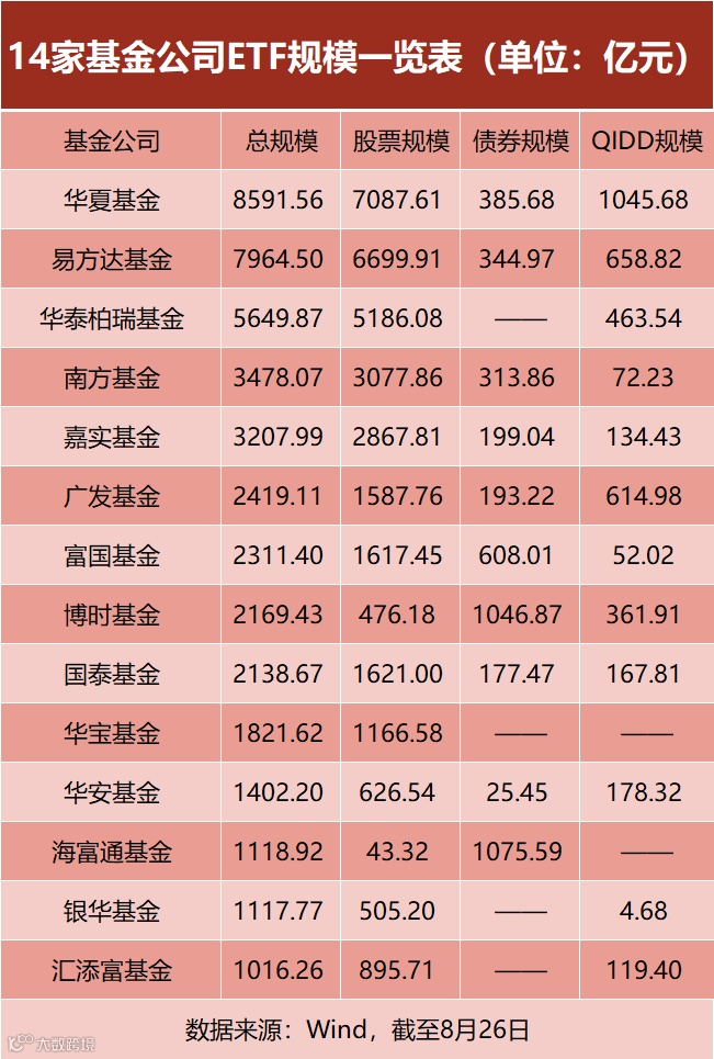 根据Wind统计,截至8月26日,全市场ETF总规模达到5.07万亿元。股票型ETF规模为3.46万亿元,占比68.25%;跨境ETF规模7537.23亿元,占比14.86%;债券ETF规模5559.03亿元,占比10.96%。分公司看,管理规模千亿元以上的机构已达到14家。