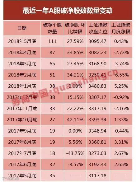 不难计算出,从2017年5月底的3117.18点到2018年5月底的3095.47点,上证指数一年内下跌了0.7%,但破净个股数量却从35只增加至111只,增幅达到217.14%。