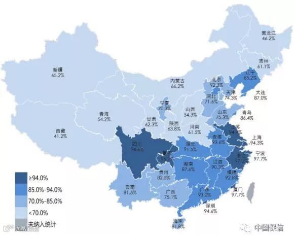 地图显示,南方地区的商业险投保率高于北方地区。其中,宁波地区商业险投保率最高,其次是厦门和浙江,商业险投保率均在97%以上。